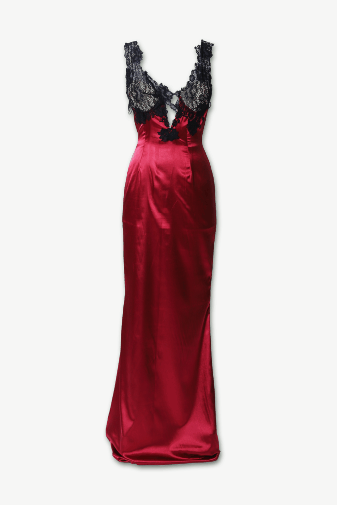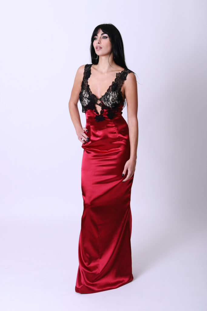 Abito lungo in raso luminoso ed elegante. Corretto in pizzo nero, sensuale e famminile.
